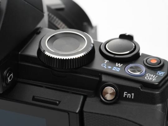 机身顶部右手边同样配备了辅助拨盘,主要用于曝光补偿的调节。相机前面的多功能控制环默认是可以设置程序自动曝光和各项AE模式。
