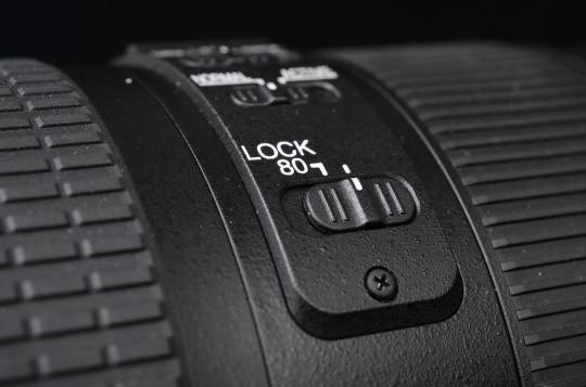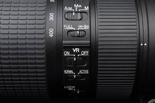 镜头侧面我们可以看到一列开关按钮。这款镜头包括3种对焦模式:A/M(自动对焦加手动控制、自动对焦优先),M/A(自动对焦加手动控制、手动优先)和M(手动),A/M与M/A区别主要是手动调整后,自动对焦是否继续工作。自动对焦距离限定分FULL全程和6m-无穷远两个选项,对于拍摄远处目标,选择6m-无穷远对焦速度会更快。VR(减震)开关,VR(减震)还分NORAMAL(普通)和ACTIVE(主动)两种模式,在普通模式下可自动平移检测,方便摇拍(水平方向不做补偿),主动模式适合于在抖动平台上拍摄使用(水平、垂直均补偿),如在船上或者汽车里。此外镜头还配备80端的LOCK锁,防止镜筒意外伸出损伤镜头(垂头现象)。值得注意的是,镜头前端边缘有一层橡胶包裹,也是起到保护作用。