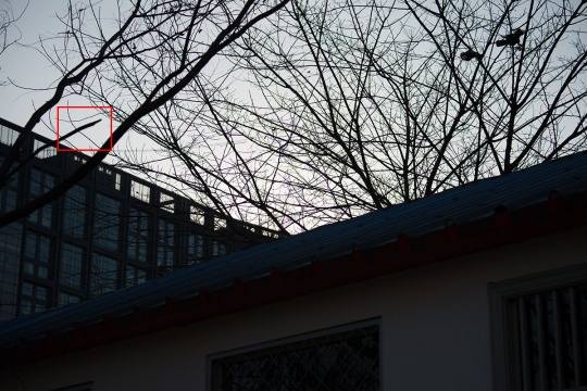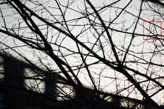 大光比逆光下,我们观察一下树枝与天空交接部分。从图中可以看到这款镜头无论80mm端还是400mm端全开光圈都存在一点紫边,80mm更明显一些,收缩光圈紫边有一定减轻(F8之后基本消失)。这款长焦镜头采用了4片ED镜片和1片超级ED镜片,从实拍来看这些特殊镜片还是起到一定的作用。