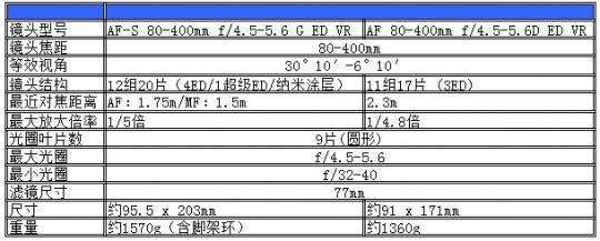 对于80-400mm这款镜头的升级,很多朋友已经期待很久了,此次更新正是迎合这种需求。那么它到底有什么改进呢?1.镜头搭载宁静波动马达(SWM),可快速安静的自动对焦;2.改进光学结构,采用纳米结晶涂层,光学素质有所提升;3.VR(减震)功能再度加强,提供相当于4档更快的快门速度(老版为3档)。下面我们具体来看新老两代规格对比: