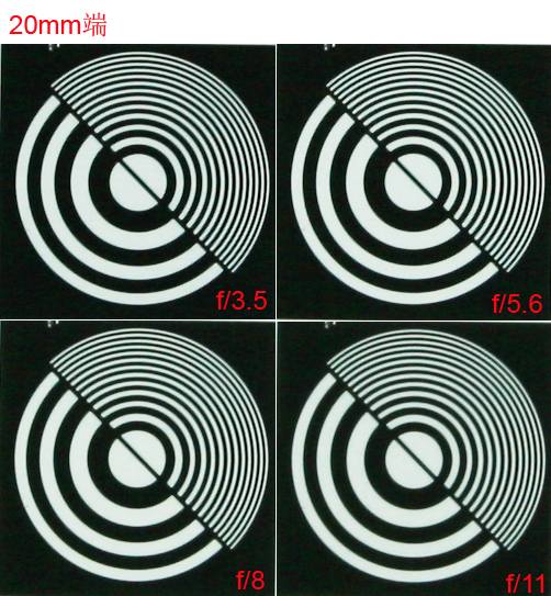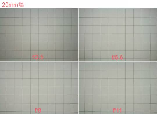 10mm端3.5~5.6光圈的表现不错,11光圈时可看出分辨率下降,相较之下20mm端3.5~5.6光圈的表现更为优异,同样在达到11光圈时分辨率下降。从整体来看,这款镜头在各焦段各光圈的分辨率表现较为平均。