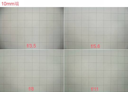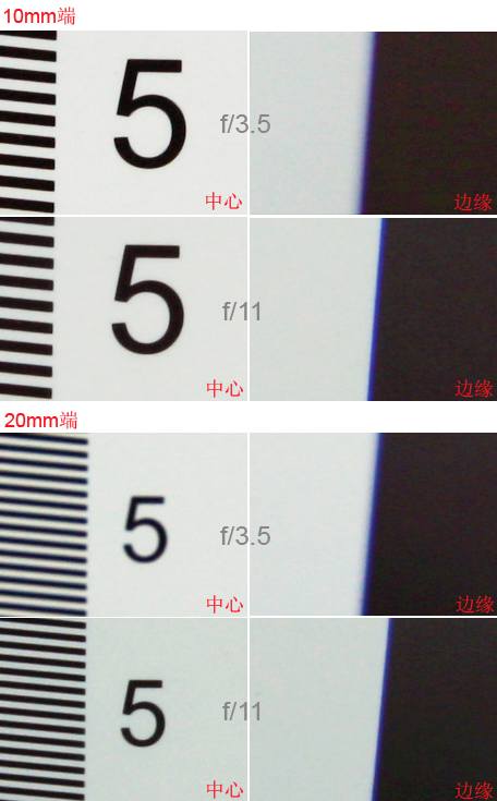 此项测试选取了这支镜头的最广角10mm端和最长焦20mm端进行拍摄测试,使用ISO200恒定,光圈分别设置为f3.5、f5.6、f8、f11,百分百截图对比,图片格式为JPG。