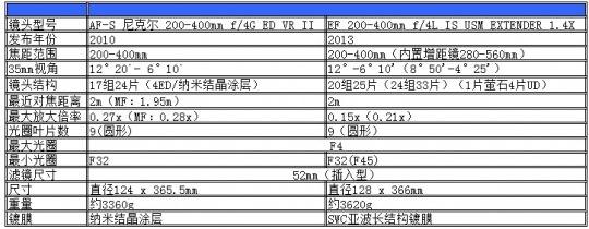 该规格镜头可以说一直是尼康的“独门绝学”,直到2011年佳能在CP+展会上展出了正在研发中的EF 200-400mm f/4L IS USM EXTENDER 1.4×的模型样品。佳能此举打破尼康的垄断局面。这支镜头除了同样200-400mm f/4规格,还内置了1.4x增倍镜,使其能够覆盖280-560mm的变焦范围,这对于体育或生态摄影提供了很大的方便。
