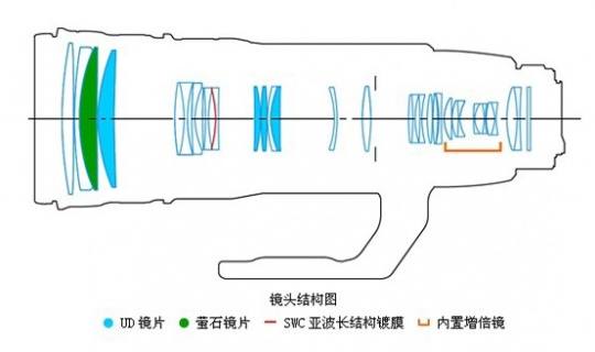左:佳能200-400mm镜头结构   右:尼康200-400mm镜头结构   佳能在前组镜片中有一片大直径萤石镜片