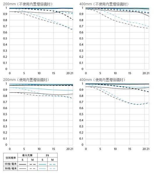 从图中可以看出200mm端F4.0全开光圈下锐度不错,收缩到F5.6-F8呈现最佳效果,而400mm端F4.0全开下就表现也非常不错,F5.6-F11属于最佳范围,这支镜头各焦段全开光圈整体锐度都保持的不错,不过光圈缩小至F16之后锐度下降较为明显,尤其F22、F32下画质较差。开启内置1.4x增倍镜后,最大光圈缩小至F5.6,整体锐度相比未开启增倍镜时要差一些,280mm的F5.6到F16锐度尚可,F22之后开始变差,尤其F32和F45锐度已经非常差了。560mm时情况与280mm相仿,尽量不要使用F32和F45这种的小光圈。