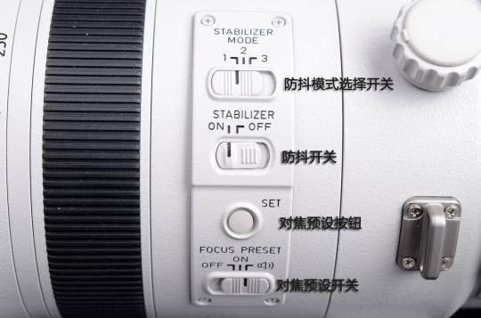 对焦环之后,进入镜头的中部,这部分是第一个开关分布集中的区域。从上至下分别是防抖模式选择开关、防抖开关、对焦预设按钮(SET)、对焦预设开关。首先说说防抖,这款镜头搭载了可获得最大相当于提高约4级快门速度补偿效果的手抖动补偿机构IS影像稳定器。防抖模式共有三种: