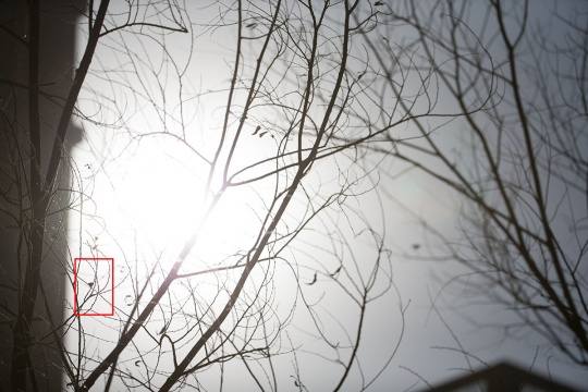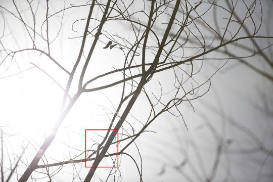 大光比逆光下,我们观察一下树枝与天空交接部分。从图中可以看到这款镜头无论200mm端还是400mm端全开光圈紫边都很轻微,400mm稍微明显一点,收缩光圈紫边程度变化不大。这款长焦镜头采用了4片ED镜片和1片萤石,从实拍来看这些特殊镜片起到比较明显的作用。
