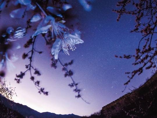 活用镜头的良好近摄能力得益于这支镜头0.15m的最近对焦距离,我将三脚架升至最高,将最近的一朵花收入画面,然后按下快门,随即将焦点调至无限远,通过多重曝光继续拍摄,触手可及的山桃花与深远的星空就这样出现在了同一张画面上。