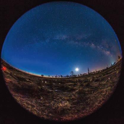 全视角可以带来更震撼的构图。春季,日出之前,银河会从东方缓慢升起,形成漂亮的圆拱形状,不过因为跨度太大,一般的镜头很难将其拍全。在这幅画面中,银河下几乎与天平分的地景增加了画面的活力,远处初升的月亮犹如眼眸中的瞳孔。得益于佳能EF 8-15mm f/4LUSM鱼眼良好的镀膜,长时间曝光下直对月亮拍摄也没有出现眩光。