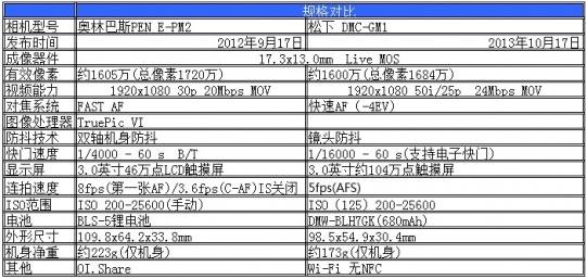 从规格对比来说,松下DMC-GM1给人的感觉是“麻雀虽小五脏俱全”,成像、对焦、视频等主要性能指标上松下DMC-GM1并不在奥林巴斯E-PM2之下,可以说已经达到M4/3的主流水平。松下DMC-GM1最大优势就是机身体积,从数据来看即便是走轻便路线的奥林巴斯E-PM2也要相形见绌。