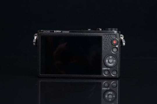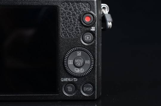 DMC-GM1的机身背面主要是录像按钮、回放按钮、控制转盘、Q.MENU(删除)、DISP信息按钮。控制转盘上下左右中可对应自动对焦模式、白平衡、曝光补偿、驱动模式及MENU菜单。按键中比较重要的是Q.MENU按钮,按下该按钮可以进入参数调节界面,通过方向键或者触摸对照片格调、闪光设置、视频设置、图像尺寸、图像质量、对焦模式、对焦点模式、测光模式、曝光补偿、感光度、白平衡等进行调整。整个机身上除了机顶Fn1按钮外并没有其他功能按钮,Fn2-Fn6均是触控屏上自定义的虚拟按键。此外,松下DMC-GM1背面配备了3.0英寸104万点显示屏不可翻转。