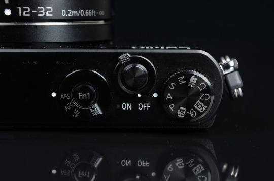由于DMC-GM1主打精致小巧,机身并没有太多的空间配备各种拨盘,正面除了对焦辅助灯(自拍指示灯)和镜头释放按钮,并没有特别的设计,非常简洁。