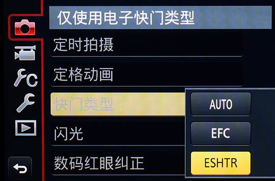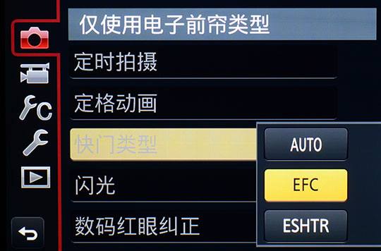 为了实现小巧机身设计,松下DMC-GM1采用了新的快门驱动结构。如果需要高于1/500秒的快门速度时,可以使用电子快门,最高快门速度可达到1/16000秒。DMC-GM1在相机菜单中提供了快门设定,除了可以自动切换机械快门和电子快门外,还可以手动选择最高1/500秒的机械快门或安静无声的最高1/16000秒的电子快门。内置闪光灯快门同步速度最高仅有1/50秒。
