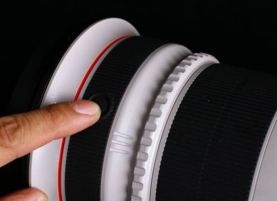 在镜头最前端设计了一组黑色的自动对焦停止钮。方便摄影师无论在横拍还是竖拍方向都能快速用手按下随时停止对焦进行拍摄。笔者认为这个锁定钮的位置设计非常好,摄影师根本不需要去看就能用左手轻松的触摸到。