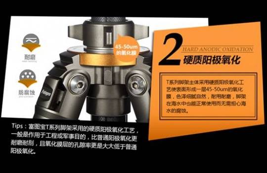 磐图T-74C用了硬质阳极氧化技术,让金属不易褪色,还可以让脚架的防腐蚀性和防刮性更强,,可以令脚架在海水中也能使用而无需担心海水的腐蚀。这种处理工艺,让脚架看上去很 惊艳、很显档次。