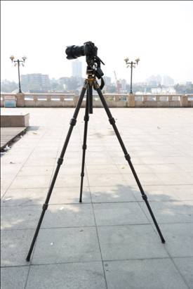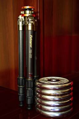 具体操作是,先展开并锁定脚架(分为升中轴,不升中轴两种情况),然后负重不同级别的杠铃片重量(5KG起步,一片一片往上加,到30KG为止),记录下脚架在不同负重下的固定位 置的垂直投影标记,对比看各个重量下的位差。再分别在各种负重的情况下,进行适度的各种稳定性测试。