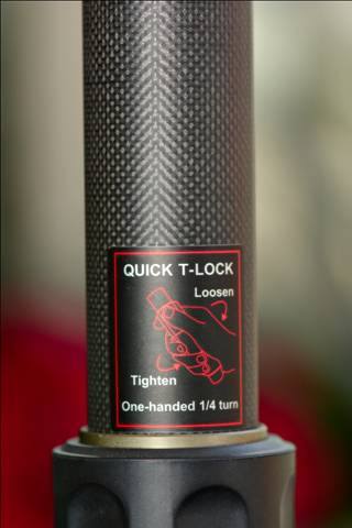 腿锁的旋转行程只有1/4圈(红色标贴上的英文是Quick T-Lock One Handed 1/4 turn),并不会对开启速度有太大的影响。