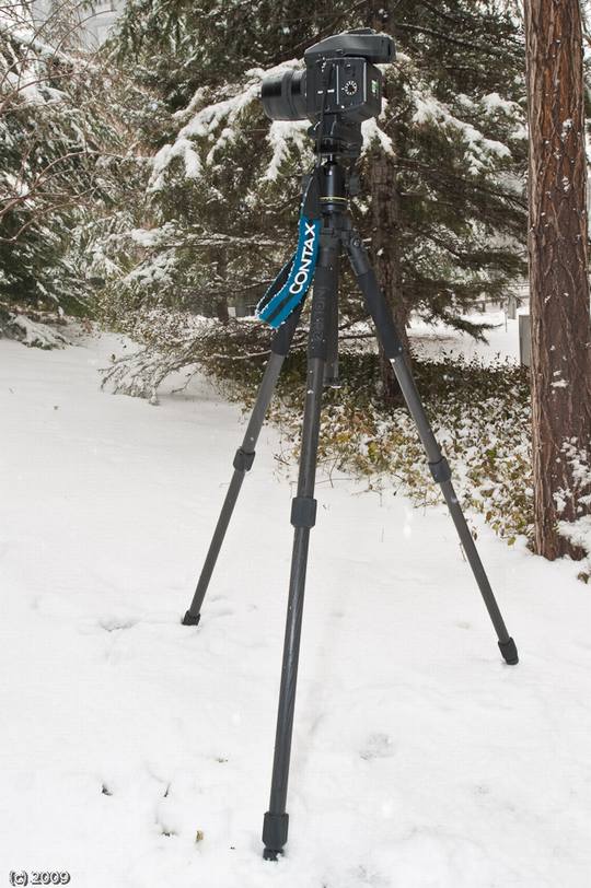 三脚架CT213的设计承重量为12公斤,最大伸展高度163厘米,折叠高度64.20厘米,自重1.5公斤。球形云台BHD1的设计承重量为12公斤,自重0.5公斤,笔者使用这个配置支撑中幅相机Contax 645进行拍摄,完全可以满足在户外拍摄的需求。在零度以下的低温雪地环境使用脚架和云台工作正常,部件转动灵活和方便。