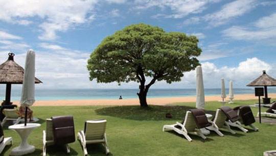 巴厘岛AYODYA酒店的内部沙滩干净漂亮,偶尔会有一小阵太阳雨,为燥热平添一股清凉与生趣,舒服至极。在低纬度的热带地区,中午的阳光几乎垂直投射,逆光和顺光的区别微乎其微,画面中大树的叶子经阳光透射,呈现出恬适的色彩。