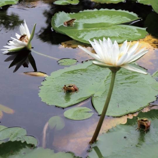 喷泉池中栽种着白色、淡紫色的小荷花,孔雀鱼等小型热带鱼在小雨中游弋,五颜六色甚是好看。仔细观察荷叶以及含苞的荷花,则经常会有一些小青蛙呆呆地趴在那里,迷你可爱,令人忍俊不禁。为了保证便携性,我将轻便“小炮”EF 70-300/4-5.6L IS留在了家中,面对这些小生物,只好用85毫米端给他们来个集体照了。
