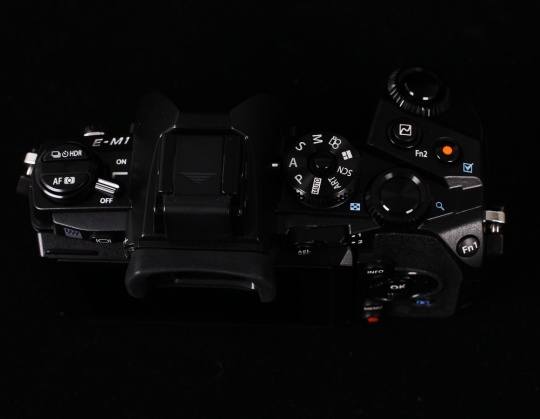 E-M1的机顶部分按钮众多,采用左右双转盘式的设计。右侧转轮为拍摄模式选择盘,在拍摄模式转盘右侧E-M1设置了前后两个波轮,方便用户直接调整快门和光圈等参数。这也是大多数专业单反相机的设计,说明E-M1的专业级定位。另外在机顶右侧还能看到一个Fn2的按钮,这是E-M1的自定义功能钮,可以人为的设定按下它后调出的可调选项。