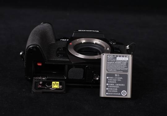 ‘ 相机的底部为电池仓。E-M1为了控制机身体积,因此电池的容量并不是很大,只有1220毫安时。续航能力一般,如果经常需要外出拍摄的用户最好多准备几块电池。
