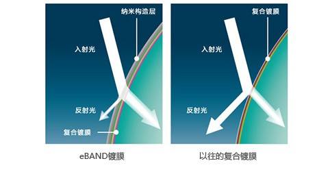 eBAND镀膜是腾龙公司开发的一种可使镜片抗反射性能飞跃式提高的新型镀膜技术。它将比可见光波长更小的纳米级(1nm=1/1,000,000mm)构造层,覆盖在高精度复合镀膜表面。