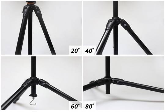 通过每条脚管顶端的按钮来调节脚架的支撑角度,根据需要可调节为20°、40°、60°、80°。