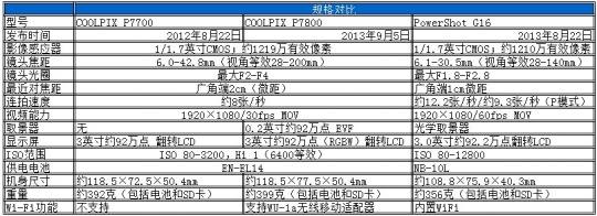 COOLPIX P7800与上代COOLPIX P7700相隔一年,这么短的周期,其实并不会太大升级,我们可以将两代产品与佳能PowerShot G16的规格进行一番对比: