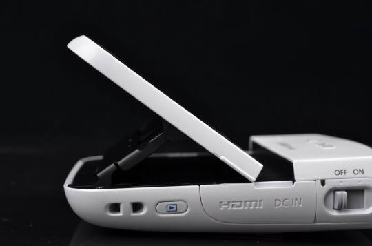 LEGRIA mini机身设计小巧轻便(76×22×96mm),仅有160克重,便于随身携带。整个机身呈方盒状态,底部内置可调角度支架,为多角度静置拍摄,顶部搭载双轴合页式设计可让2.7"23万点触摸电容屏以90度角直立,也可翻转约80度。如果你将LEGRIA mini支起,会觉得它像是一个迷你版投影仪。当然很多开车的朋友会觉得LEGRIA mini非常眼熟,这不就是行车记录仪吗?