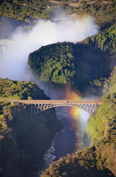 切开岩石的水流让人感到无比震撼赞比西河分割了赞比亚和津巴布韦,每分钟5亿立方米的河水速度倾泻入玄武岩峡谷之内,飞溅的水雾远在20公里外都可以看到。随着螺旋桨转起,直升机在瀑布上空左右盘旋。我觉得使用语言已经无法描述出眼前美景的壮观,唯有伴随着不断响动的快门,去记录这一刻的美妙。