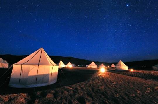 夕阳中的沙漠酒店。顾名思义,地处在撒哈拉腹地的“火星帐篷”酒店就是由散落在沙漠上的一顶顶帐篷组成的。已近黄昏,画面中从阴影到天空都有着非常丰富的细节。