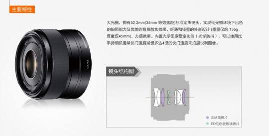 E 35mm F1.8.OSS拥有52.2mm(35mm等效焦距)标准定焦镜头/ 重量约155g/ 厚度45mm/ 内置光学图像稳定功能