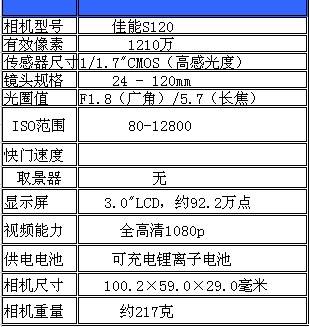 S120是上一代S110相机的升级版,主要升级了图形处理器。2013年佳能全使用了最新的第六代处理器,无论是相机处理反应速度还是画质表现都有所提升。另外镜头的最大光圈也从F2.0提升到F1.8,虚化能力更强。下面是S120相机的主要基本参数。