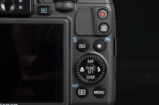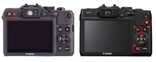 背面方向转盘周围的按钮也有变化,ISO从转盘上单提出来,替代原来的对焦区域选择按钮,而对焦区域选择按钮被挪到下方替代了原来的测光模式按钮,同时该按钮在回放时起到开启Wi-Fi的作用。MF功能则从原来微距开启上独立出来。这可能因为PowerShot G16增加了手动对焦峰值功能,佳能想更突出MF,而将独立测光按钮取消。