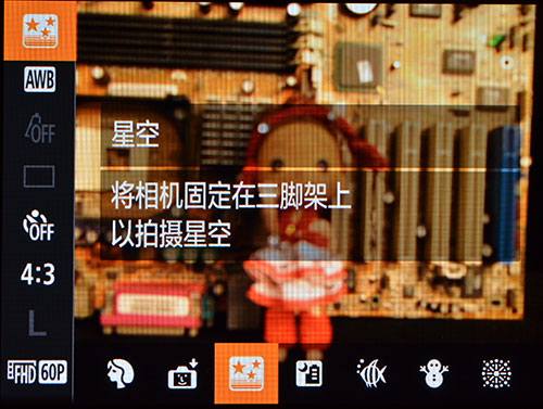 SCN特殊场景模式中PowerShot G16新增添了星空模式,能够拍摄夜景下星空的照片。 拍摄星空轨迹,该机每次拍摄过程最多持续约2小时。拍摄星空间隔短片,指定的时间段内,连续拍摄星星的静止图像,并将其合并为一段短片。相机每分钟拍摄一次。每次拍摄过程将最多持续约2小时,并会拍摄很多张照片。