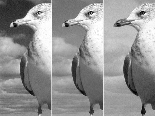 图3是某低档数码相机拍摄的照片,噪声较大,尤其是红色通道(图4,从左到右分别是R、G、B通道)。