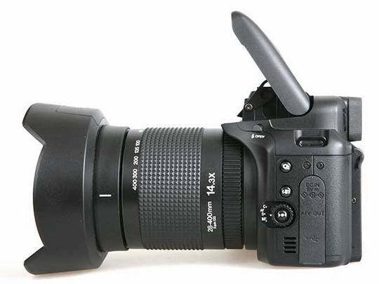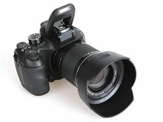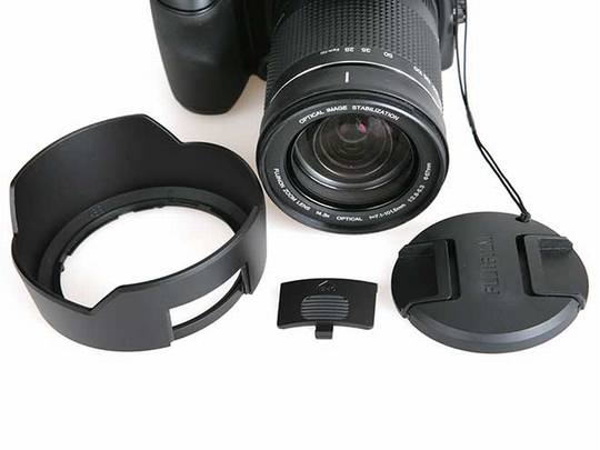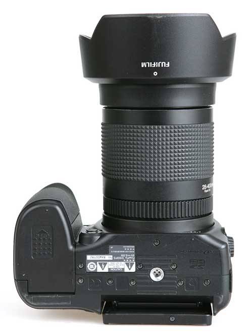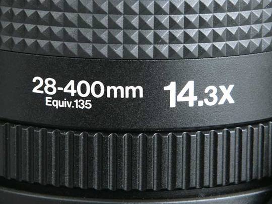 首先,正面的镜头在体积上有些增加,在焦距方面,S100FS的焦段从S9600的28-300mm延伸到了28-400mm,同时加入了光学防抖功能。对焦环还是设计的靠近机身,阻尼略松,这样调节起来很省力,变焦环的宽度比S9600几乎增加了一倍,防滑设计也更细腻,阻尼适中。遮光罩上设计了滤镜调节装口,这是前代S9600没有的。