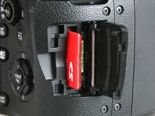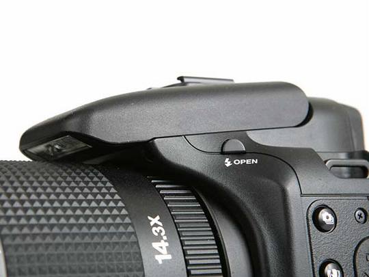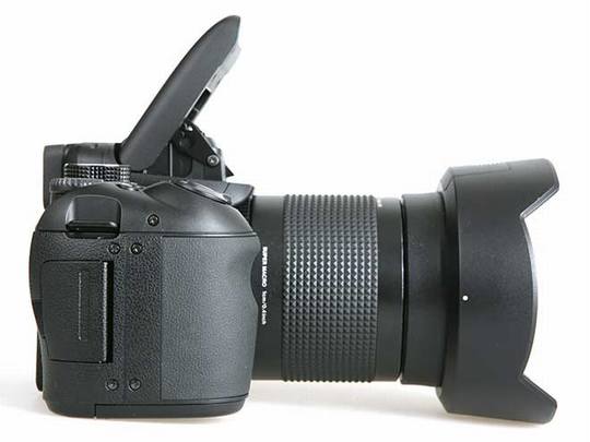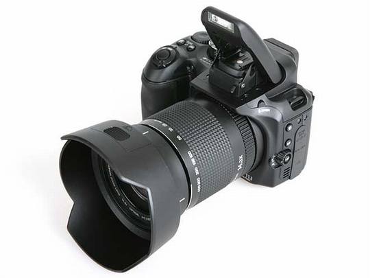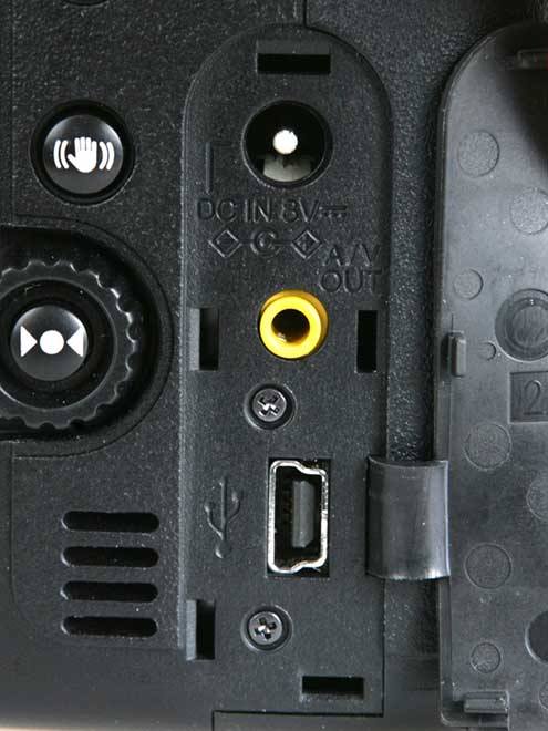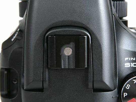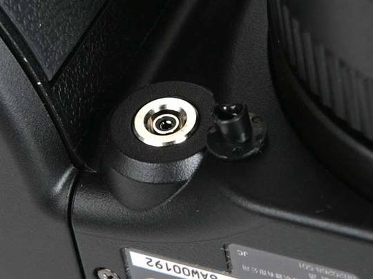 手柄处的设计更加圆润,快门按钮和机身一样被设计成了黑色,在这之前一直都是银色的,而且快门线接口取消了。镜头旁边的对焦辅助灯也设计的比较小巧了。在镜头的下面靠近手柄的地方是引闪线接口,但是这个位置有些别扭,在使用过程中相机如果平放在桌面上的话就会压住引闪线。