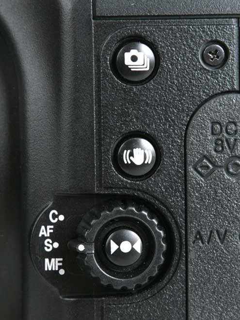 机身右侧是对焦模式、防抖开关和拍摄模式,除了对焦模式键外,其他两个功能键都是新增加到这里的。其中的连拍模式有很多选项,包括连拍、连拍(3M)、动态范围包围、胶片模拟包围、自动包围曝光、循环连拍、长时间连拍。另外一侧是存储卡插槽,与S9600不同,S100FS也摒弃了CF卡,开始支持SD卡和xD卡的联合插槽,虽然存储卡槽变小了,但是相机体积却做的更大,这一方面是为了更好的持握手感,但另一方面,电源方面的改进也是其中的原因之一。S100FS使用的是可充电锂电池,这就比S9600的4节AA电池在续航方面有了大幅的提高。