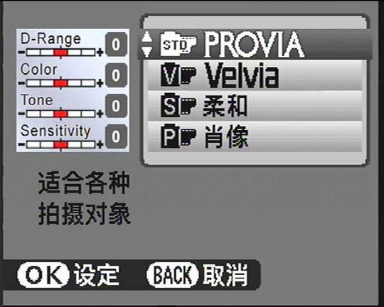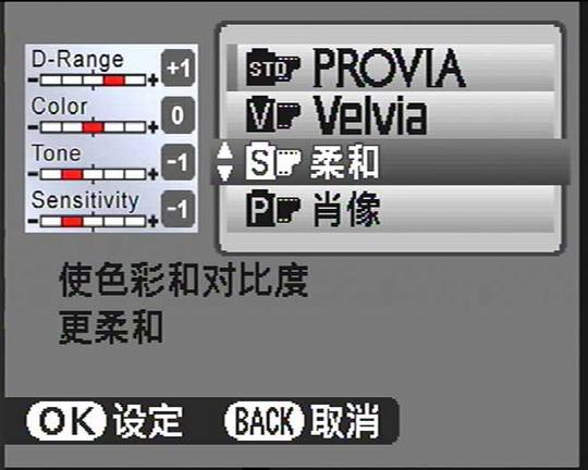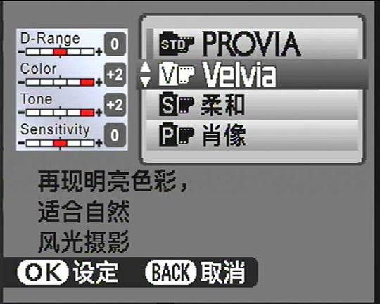 前面我们已经说过了,是S100FS的特色之一就是加入了胶片模拟功能,在进入选项界面后,可以看到屏幕右侧是胶片模拟选项,下面还有相应的拍摄说明,告诉使用者各种模式的胶片选项适合拍摄什么题材的照片。屏幕左侧是机内设定好的四类参数:D-Range(动态范围)、Color(色彩)、Tone(色调)、Sensitivity(敏感度),对比各项胶片模拟选项,我们可以看见在选择Velvia时,这四个参数都没有加减档,这个时候适合拍摄各种类型的照片;在选择Provia时,D-Range和Sensitivity保持不变,而Color和Tone各增加了两档,这个时候由于色彩与色调的加强,适合拍摄一些风景照片;在选择ASTIA(柔和)时,D-Range保持增加一档,Color保持不变,Tone和Sensitivity各减一档,这个时候动态范围加大,色调和敏感度降低,所以适合拍摄一些低反差的照片;在选择肖像时,D-Range和Tone各增加一档,而Color和Sensitivity各降低一档,把动态范围和色调增强,同时降低色彩和对光线的敏感度,正适合用来拍摄人像照片。