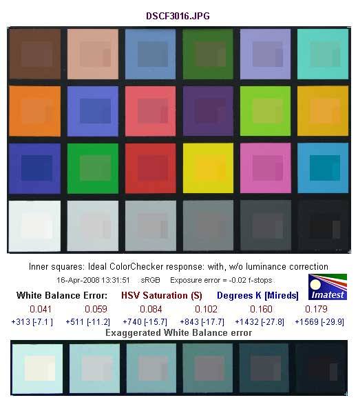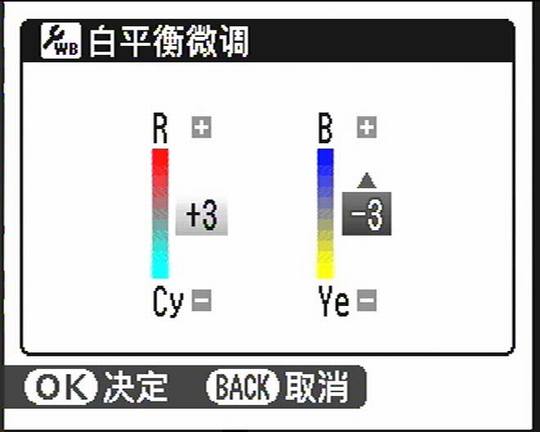 S100FS的菜单里面还增加了一项对白平衡的微调功能,在这个界面中我们可以看到,这里有两条渐变的色带,分别是从R(红色)到Cy(青色)和从B(蓝色)到Ye(黄色),渐变色调各分为7档,范围是±3。