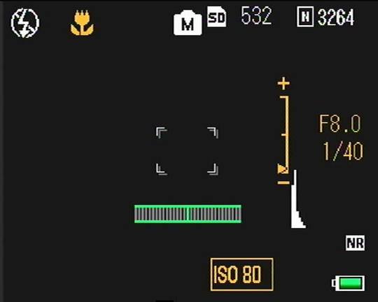 还有一个景深适宜功能,在使用SNAP抓拍或者对焦模式时,在液晶屏幕的左边会出现一个对焦距离显示条,可以看到显示条有一部分是绿色的,这部分就是景深范围。通过改变光圈大小我们可以直观地观察到景深的变化,这个功能简单明了,对提高抓拍的成功率有很大的帮助。