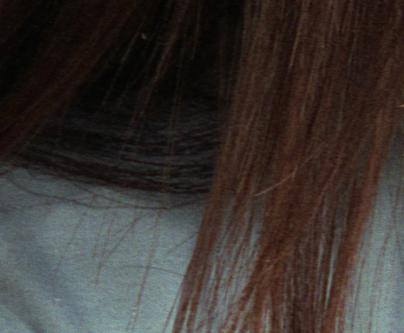 观察暗部细节可以看出一个扫描仪的动态范围,上图是48位3200DPI下扫出来的片子在100%时裁下的头发部分的细节,可以看到在这样的暗部头发丝还是根根清楚,而且颜色的层次也很分明。需要提到的是转换到24位的JPG图后,从显示器上看到的细节差了很多,主要表现在发丝的颜色发灰,同时暗部的细节看不到了,所以建议大家要输出时最好保存成48位的TIFF格式,显示器在32位显示模式下都能看出区别(俺的显示器是IBM P7017寸,工作站用),到支持48位的专业输出设备上我相信会有巨大的差别,这个在很多DX关于此类话题的帖子里已经说得很多了,这就不再罗嗦了。