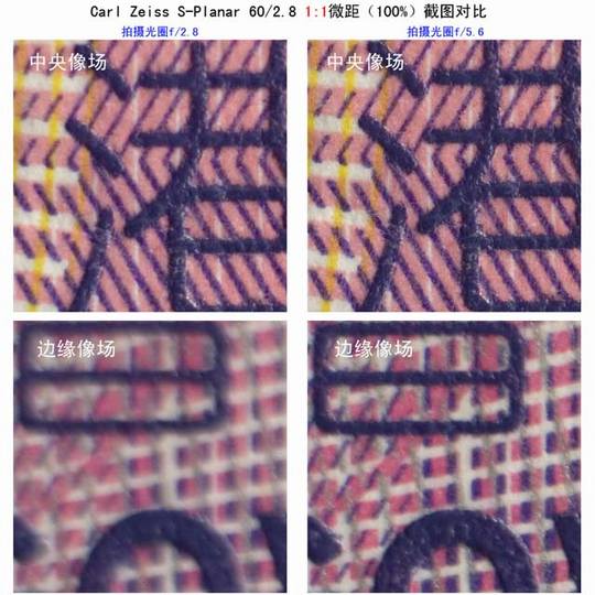 可见,蔡司SP60/2.8在1:1微距时的像场不够平直,存在弯曲,f2.8时很明显,边缘成像远比中央成像为差,收小至f5.6后则很大改善。