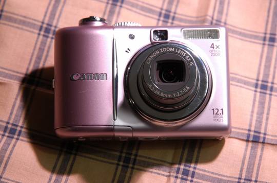 A1100 IS的外观简约大方,本次推出了4种颜色,我拿在手里的这款为淡紫色,准确地说,它的外观左侧为淡紫色,右侧则为银色。机身前面有一条银色的突起,便于握持,镜头处为电镀亮圈,非常显眼。2.5英寸LCD显示屏占据了机身后面2/3的面积,尽管很多小型DC都取消了光学取景器,而佳能一直没有取消这个设置。这对不习惯用LCD取景的用家来说是件好事,也使其在机身尺寸和LCD的尺寸方面受到制约。
