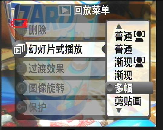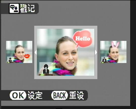 回放功能:脸部优先、幻灯片、剪贴版式幻灯片、裁切、博客模式 (带图像处理功能)、包括微缩略图模式的多幅画面回放、由日期排列、图像旋转、语音注释