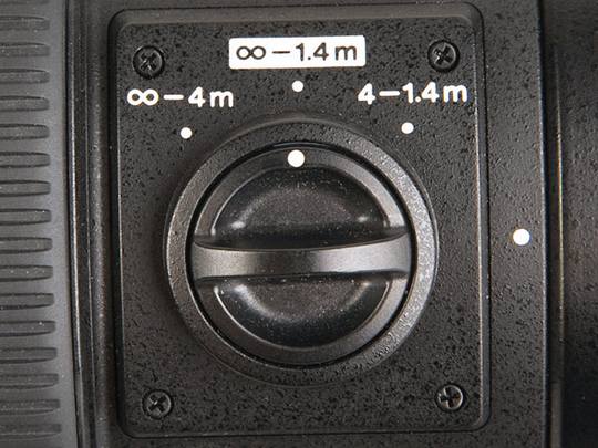 这支镜头的最近对焦距离为1.4m,为了提高AF速度,用户可以自己设定镜头的对焦范围。这个功能可以通过镜头侧面的这个拨盘实现,一般还是建议普通用户将它设定在常规的1.4-无限远挡上。而我在拍摄一些运动场景(扫街、街头篮球、T台)时则喜欢把镜头对焦范围限制在4M-无限远档上。这样设置可以避免镜头不必要的大幅度来回前后寻找对焦目标,大大提高了AF对焦的速度。
