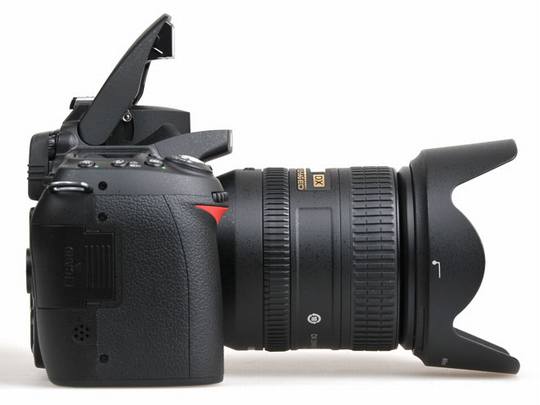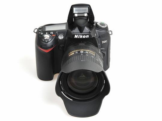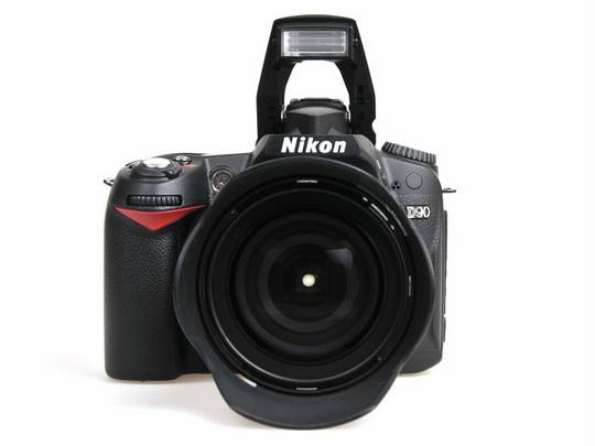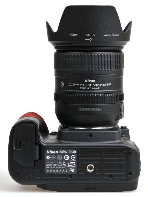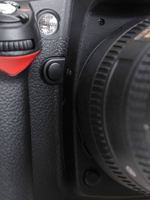 从正面来看,其与D80几乎没有什么区别,手柄内侧和镜头之间是对焦辅助灯、Fn快捷键和景深预览按键,D90铭牌一侧的按键排列位置也没有变化,从上到下分别是闪光灯控制键、包围曝光控制键BKT和最下面的手动/自动对焦切换键。要说机身正面唯一与D80有点区别的就是手柄处的红色标志,这个尼康特有的“红色内裤”在D90上被设计的更加细长流线。