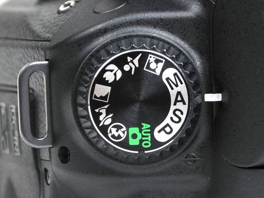 机顶部分左右两肩的设计都完全一样,左肩的模式转盘上面包含了普通曝光模式和一些场景模式,自动、程序、光圈优先、快门优先、手动、夜景人像、运动、微距、风景、人像和禁止闪光灯11项;右肩部分的按键分别为电源开关、副屏背景灯与快门按键组合、测光模式键、曝光补偿键、拍摄模式键(包括连拍、自拍和遥控拍摄)和自动对焦模式键。